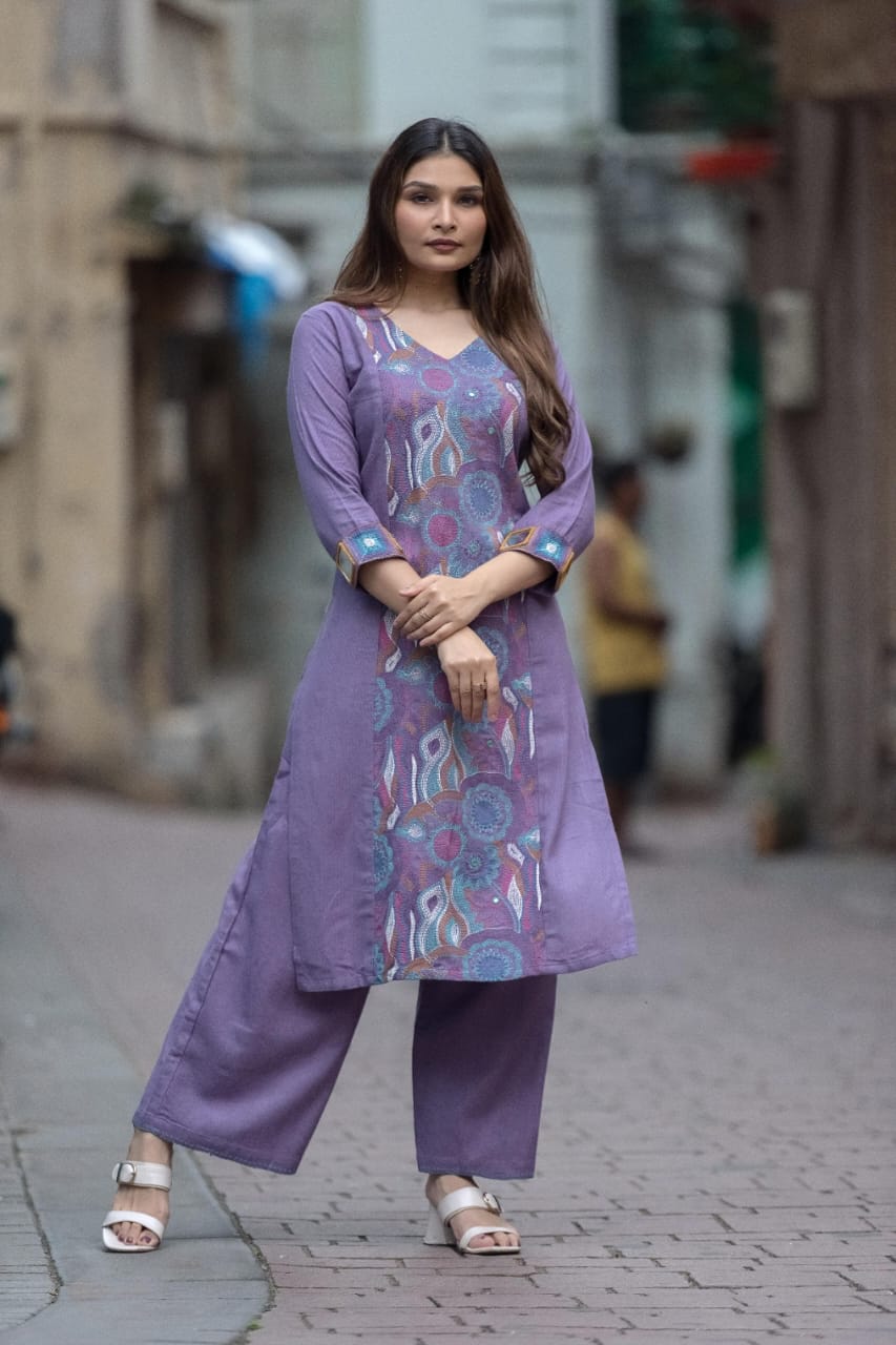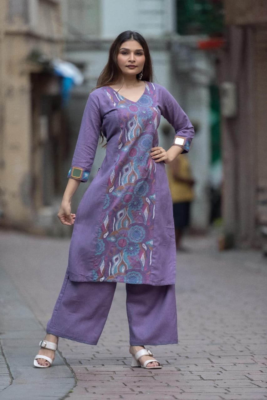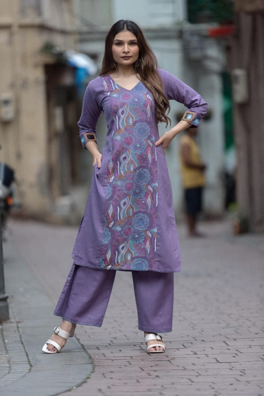Elevate your style with this exquisite lavender purple ethnic linen cotton hand-embroidered kurta, designed for both comfort and elegance. The ensemble includes a long-sleeved kurta-style top with a chic V-neckline, reaching mid-thigh length, and featuring intricate abstract patterns in teal, pink, brown, and white that mimic paisley and flame-like designs. The sleeves are detailed with unique teal square cuffs bordered in yellow, adding a distinctive flair. Paired with wide-legged, ankle-cropped pants made from soft cotton , this set offers a relaxed yet sophisticated fit.