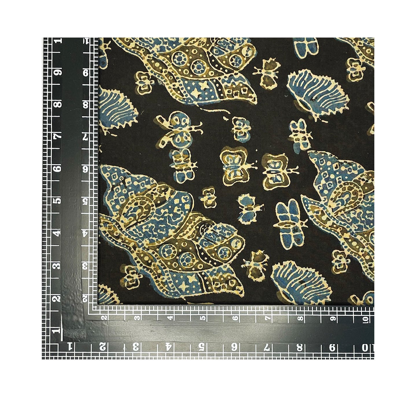 AJRAKH Hand-Block Fabric with GRAY - INDIGO BLUE - MUSTARD YELLOW shade.